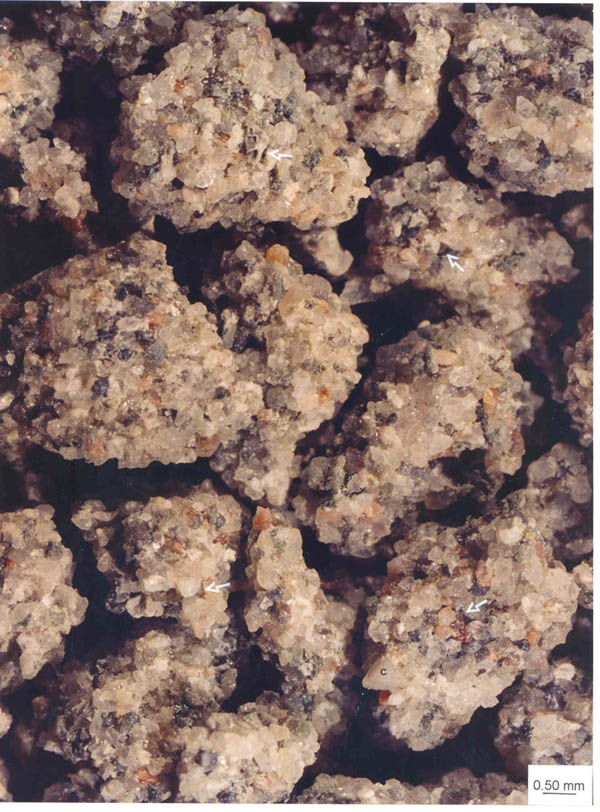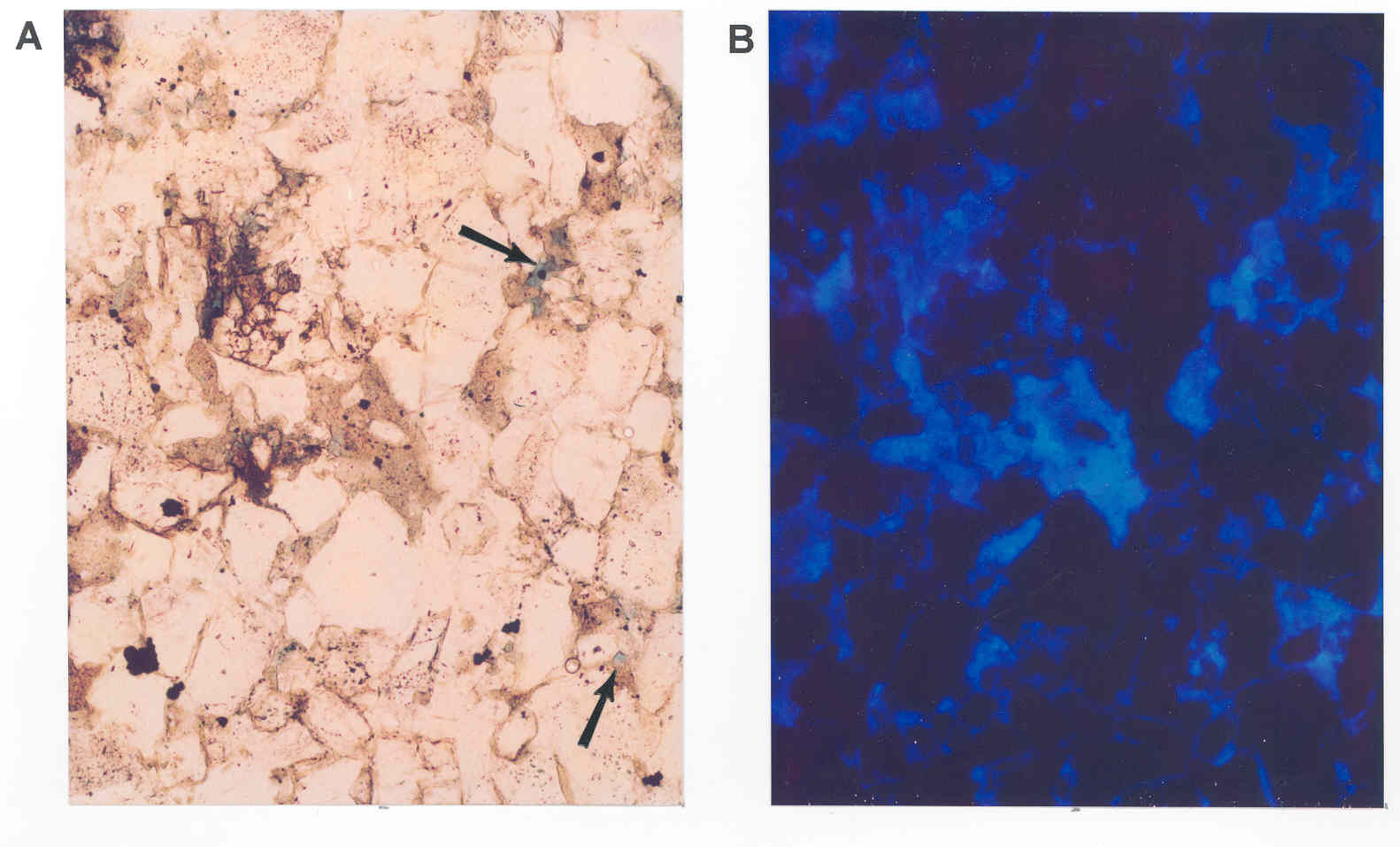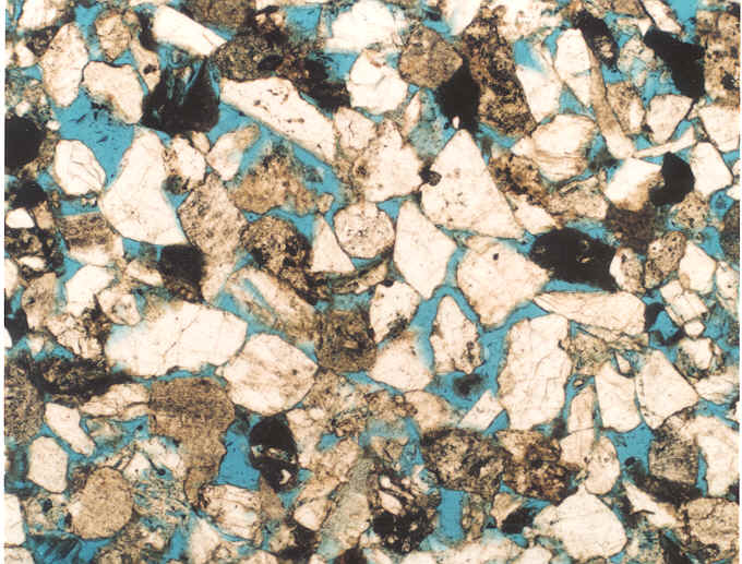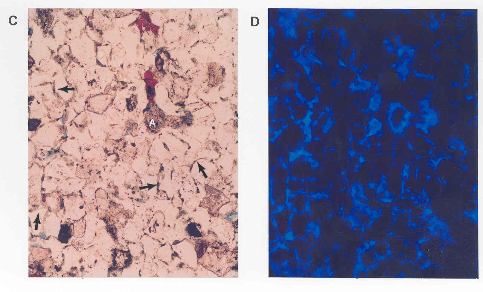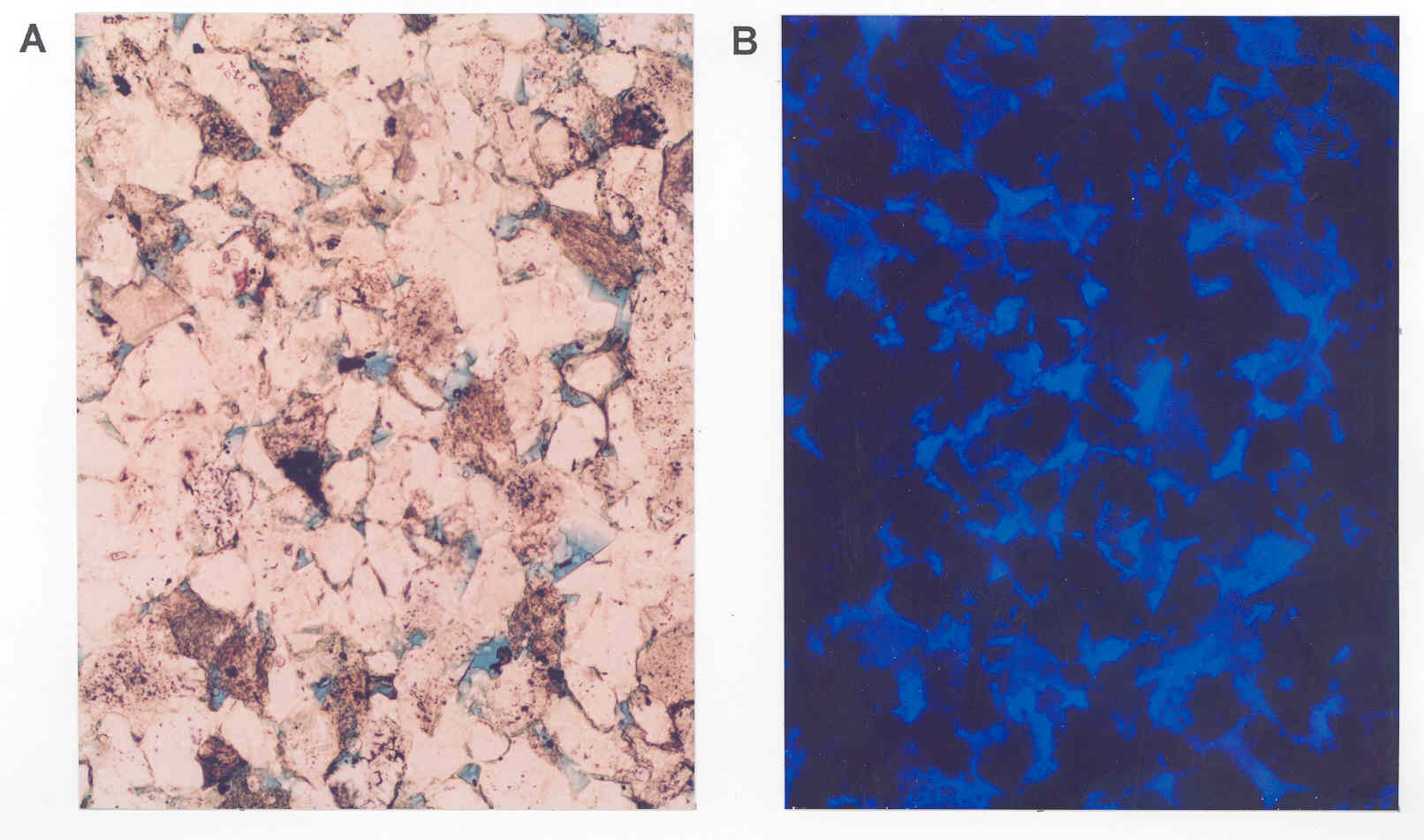 Thin sections, impregnated with blue epoxy to highlight pore space, provide information on texture (grain size, sorting) grain composition, intergranular phases and pore types. Modal analysis data (point count) quantifies each of the rock and pore space components as a percentage of the rock volume. Fluorescent light microscopy uses an auto-fluorescing epoxy to help identify pore space not large enough to be visible during standard thin section evaluation. This "microporosity" can be present in altered grins, intergranular clay and very small remnants of intergranular pores.